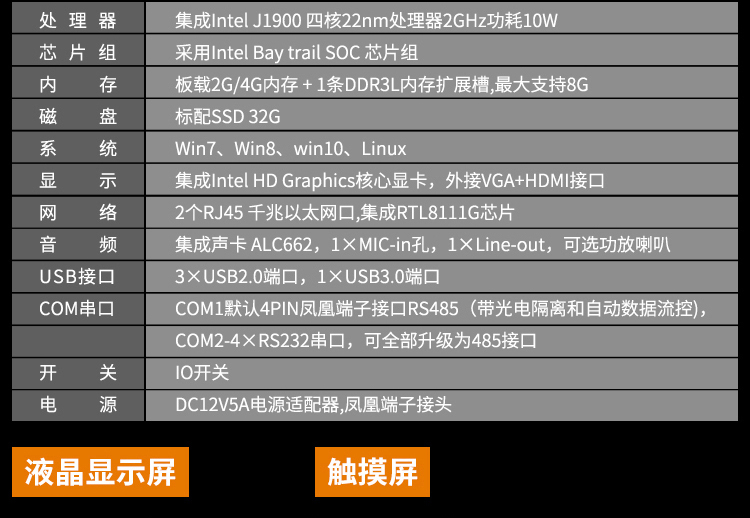 标配:12.1寸触摸鲸鱼体育直播,Intel N2930四核处理器,1.83G主频,4G内存,64G硬盘,分辩率800×600,