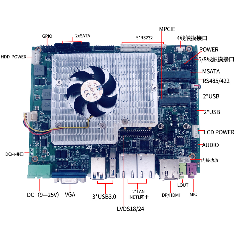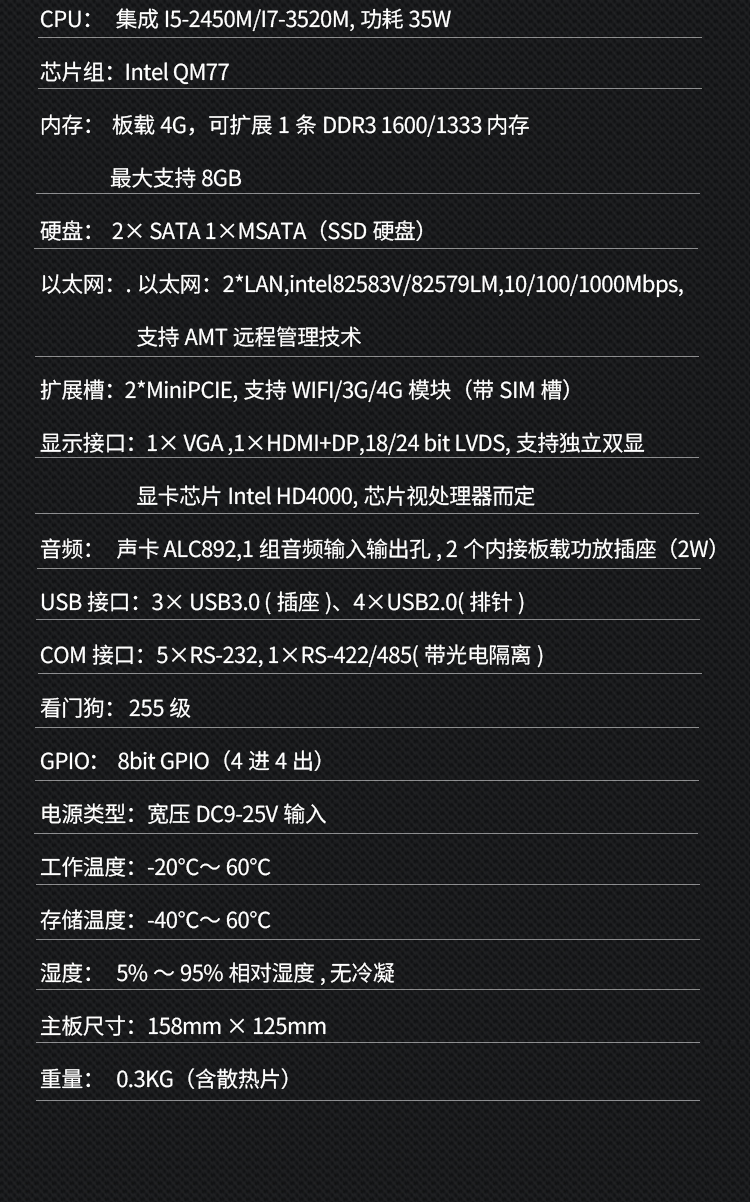 CPU i5-2430M处理器, 板载4G内存, 3×USB 3.0, 4×USB2.0, 5×COM-RS232,1×COM-RS422/485带光电隔离,2×LAN英特尔网卡,1×VGA, 1×HDMI, 1×DP,1×GPIO,1×MSATA, 2×MPCIE。