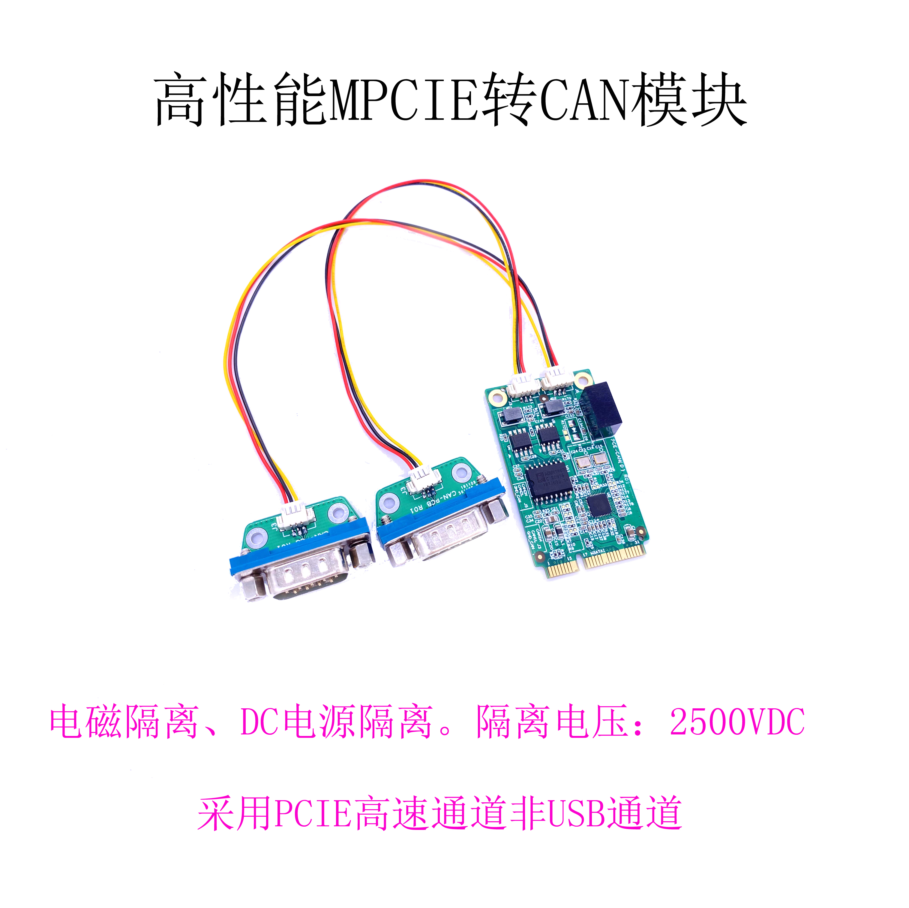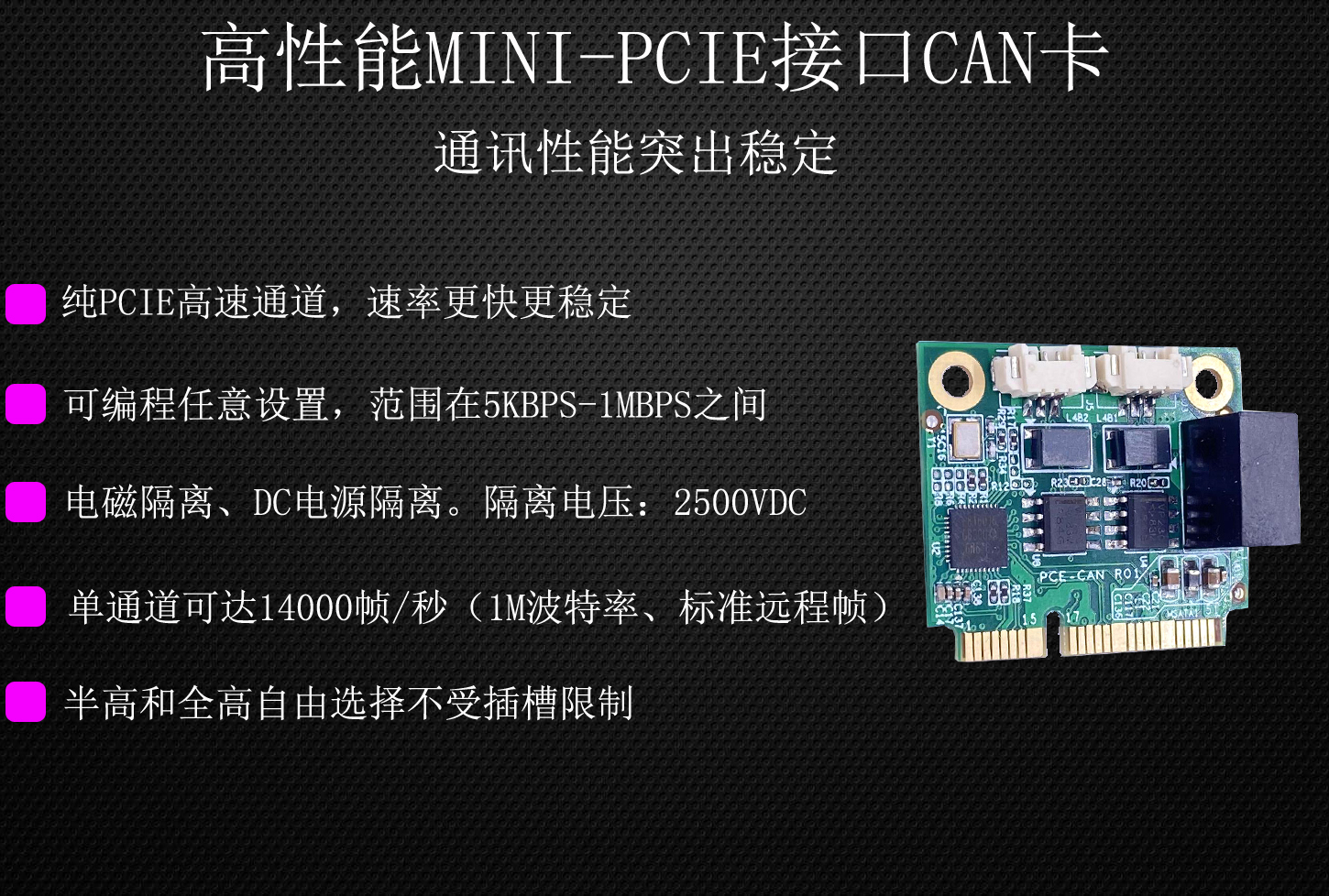 高性能Mini-PcieCAN卡,可以将带Mini-Pcie卡槽的主板扩展出两路CAN接口,采用标准的Mini-Pcie半高/全高板卡尺寸,方便安装带带有mini-pcie卡槽的设备上使用