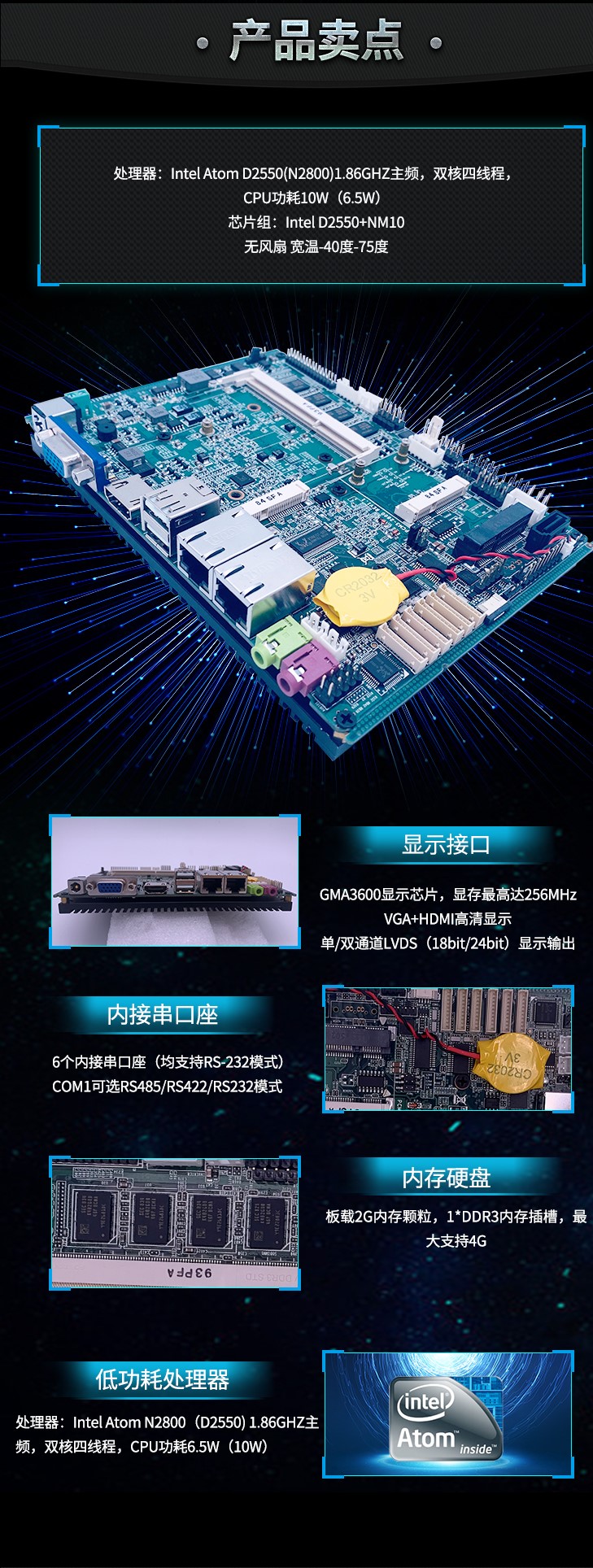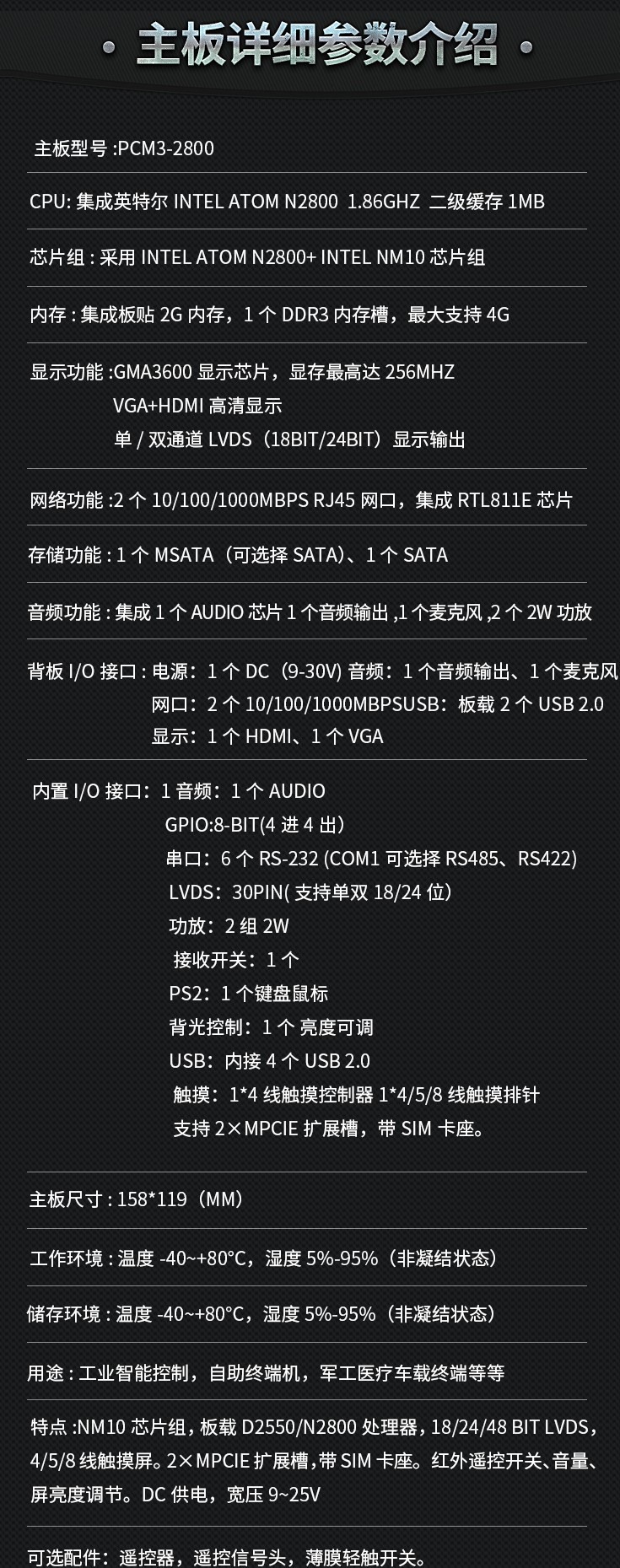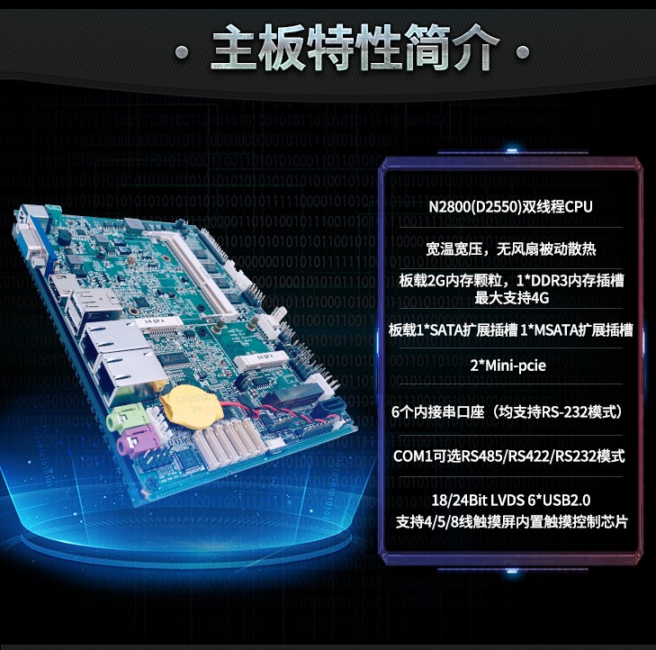标准配置:D2550 CPU,1.86G主频,集成2G内存,板载1×VGA,18位 LVDS, 2×USB端口 ,1×HDMI, 2×LAN,内接4×USB ,1×8位GPIO,1×SATA,1×MSATA,2×MPCIE,6×RS232, 1×PS2,SIM槽,AUDIO排针,音频输入输出孔,电源孔(9V-30V宽压),宽温-40℃-80℃工作环境.