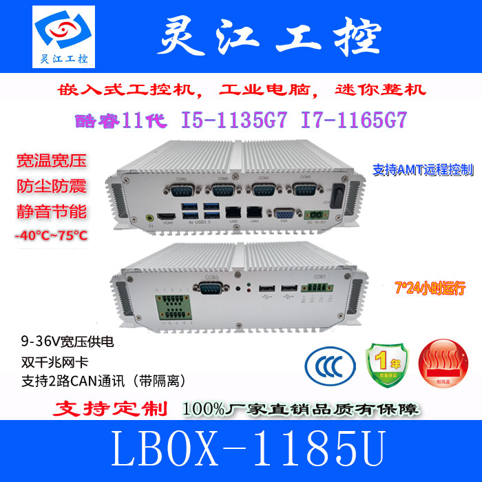 型号:LBOX-1185U ◆无风扇散热,宽温-40℃~80℃,宽压9V~36V,支持硬件来电开机 ◆集成Intel Whiskey Lake-U 四核处理器 I5/I7 可选10代赛扬处理器 ◆ 板载8G内存或16G内存和1条DDR4 2400/2666内存插槽,最大支持64GB ◆ 支持DP+HDMI+VGA显示三显输出; ◆ 2个intel千兆以太网 ,4× USB3.0 + 2×USB2.0 ◆ 6×COM ( 5×RS232,1×RS485支持自动流向控制) ◆ 8位GPIO接口